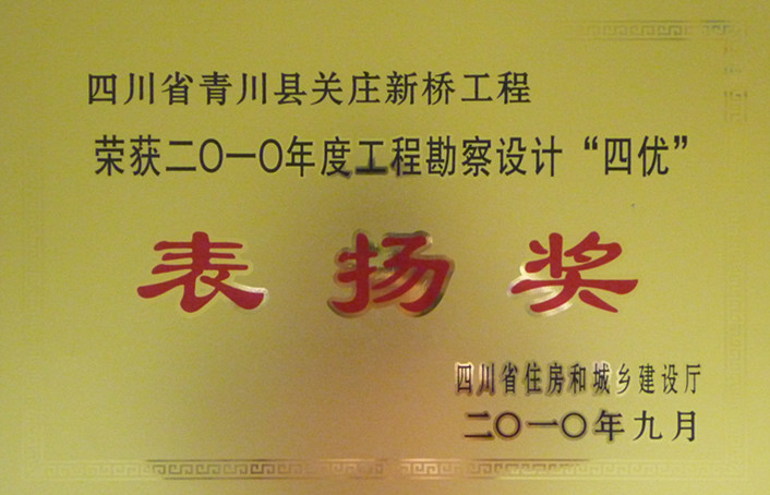 榮獲四川省住房和城鄉(xiāng)建設(shè)廳頒發(fā)的“四川省青川縣關(guān)莊新橋工程項(xiàng)目” 2010年度工程勘察設(shè)計(jì)“四優(yōu)”表?yè)P(yáng)獎(jiǎng)