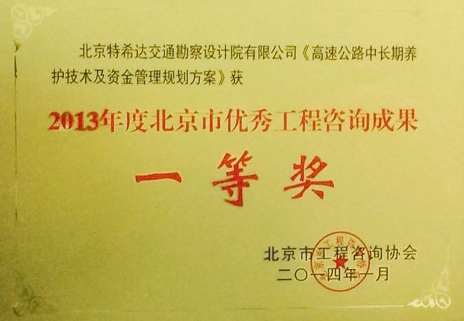 榮獲北京市工程咨詢協(xié)會頒發(fā)的《高速公路中長期養(yǎng)護技術及資金管理規(guī)劃方案》2013年度北京市優(yōu)秀工程咨詢成果一等獎